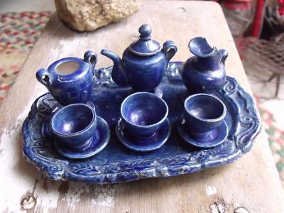 Miniature Primitive Vintage Hand Made Pottery Set Doll Sized Tray Pitcher Cups