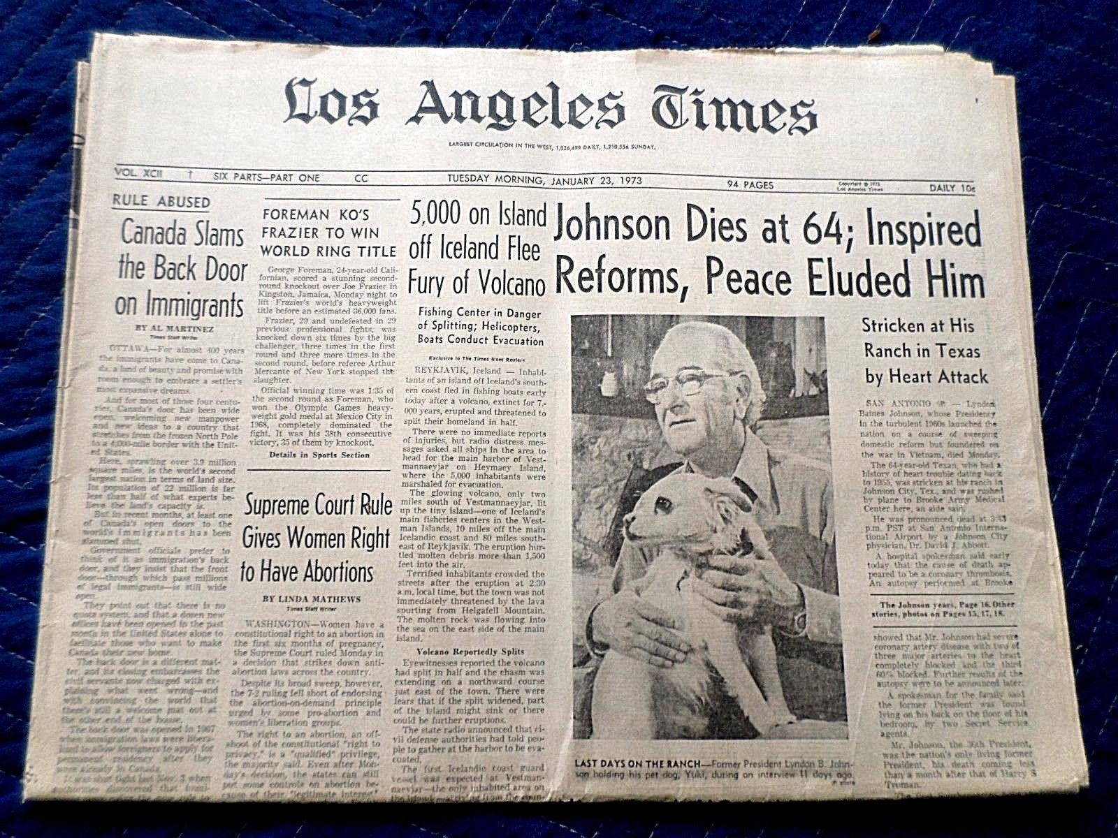 1973 PRESIDENT JOHNSON DIES - SUPREME COURT APPROVES ABORTION LOS ANGELES TIME P