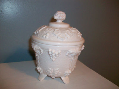 Pink Milk Glass POWDER PUFF JAR w/LID ~ Grapes/Leaves