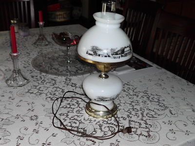 VINT. CURRIER & IVES MILK GLASS HURRICANE LAMP ELECTRIC