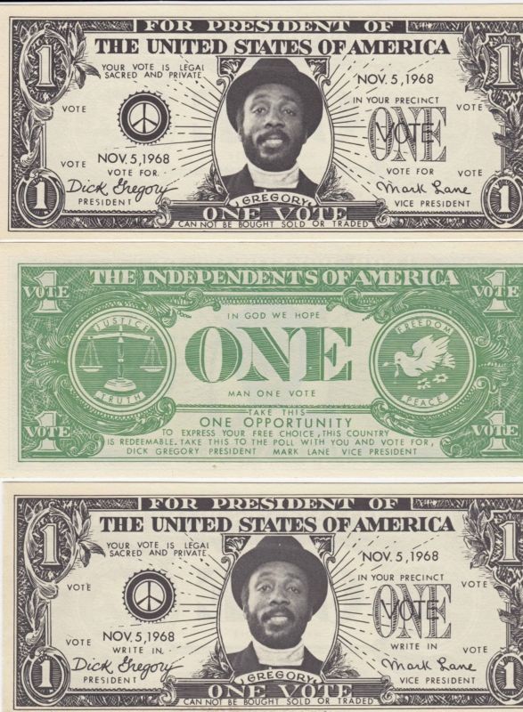 Title (ebay affiliate link): Vintage 1968 Dick Gregory for President Dollar Bills (3) Uncirculated Condition