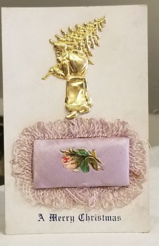Title (ebay affiliate link): Brass Santa Claus attached, Purple pillow, with Rose Scrap, Xmas PC. Germany
