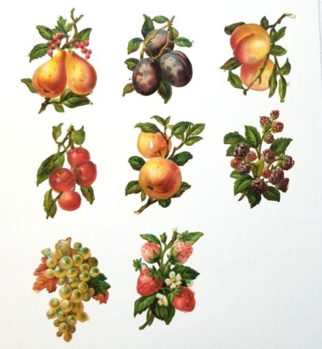 Eight Fruit. Pears, Plums, Peaches, Berries. etc. all late 1890s German Scraps