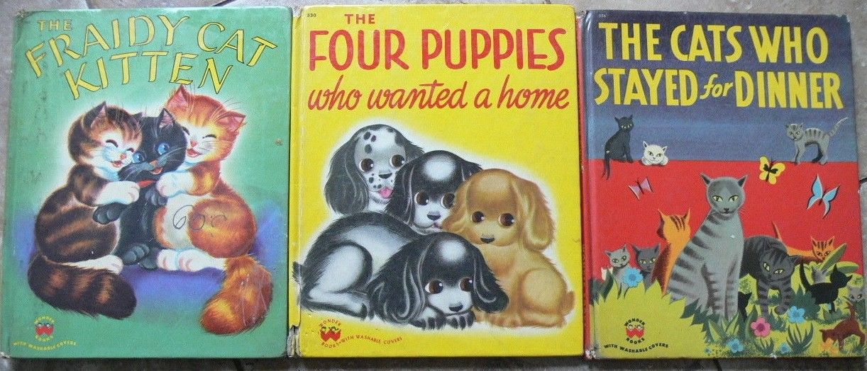 Title (ebay affiliate link): 3 Vintage Wonder Books ~ CATS WHO STAYED FOR DINNER, FRAIDY CAT KITTENS, FOUR