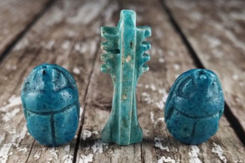 Title (ebay affiliate link): EGYPTIAN GLAZED SCARABS AND DJED PILLAR PAIR FAIENCE SCARAB BUG BEETLE BEAD SEAL