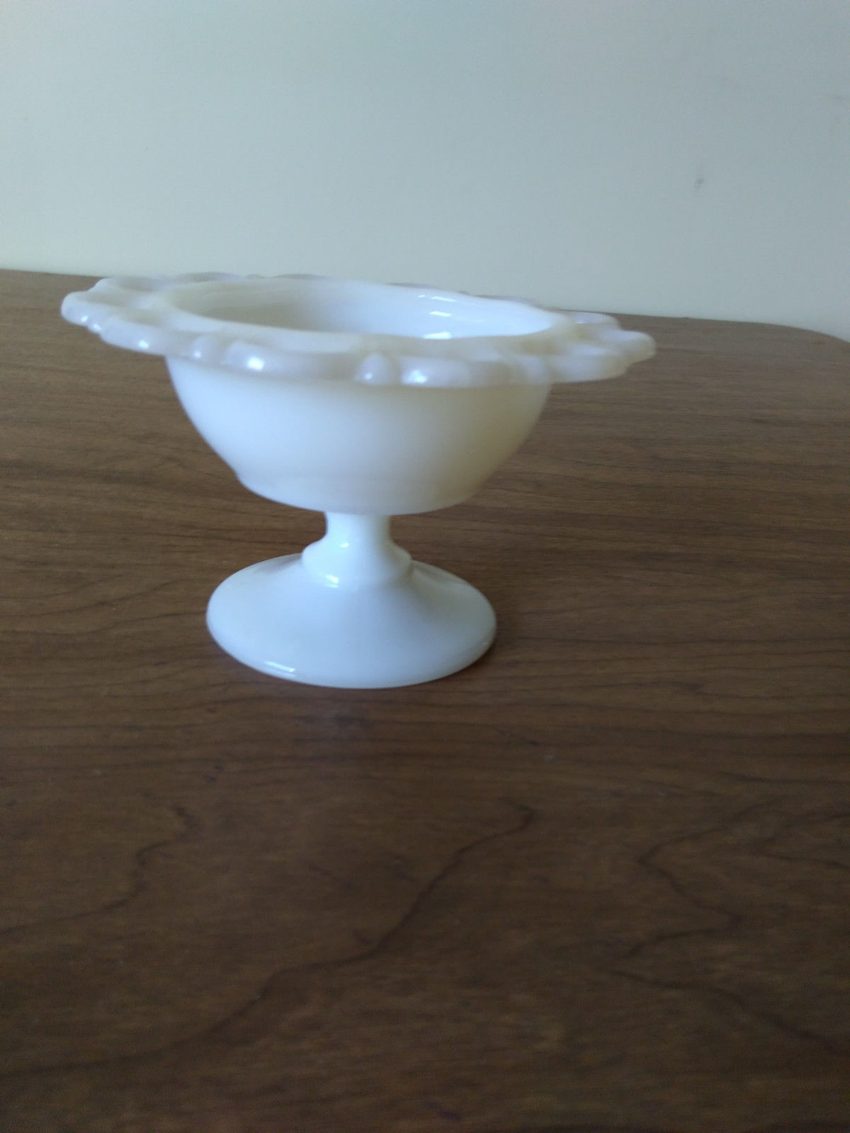 Title (ebay affiliate link): Milk Glass Pedestal Lace Edge Footed Bowl Dish 5 1/4" across, 3" tall