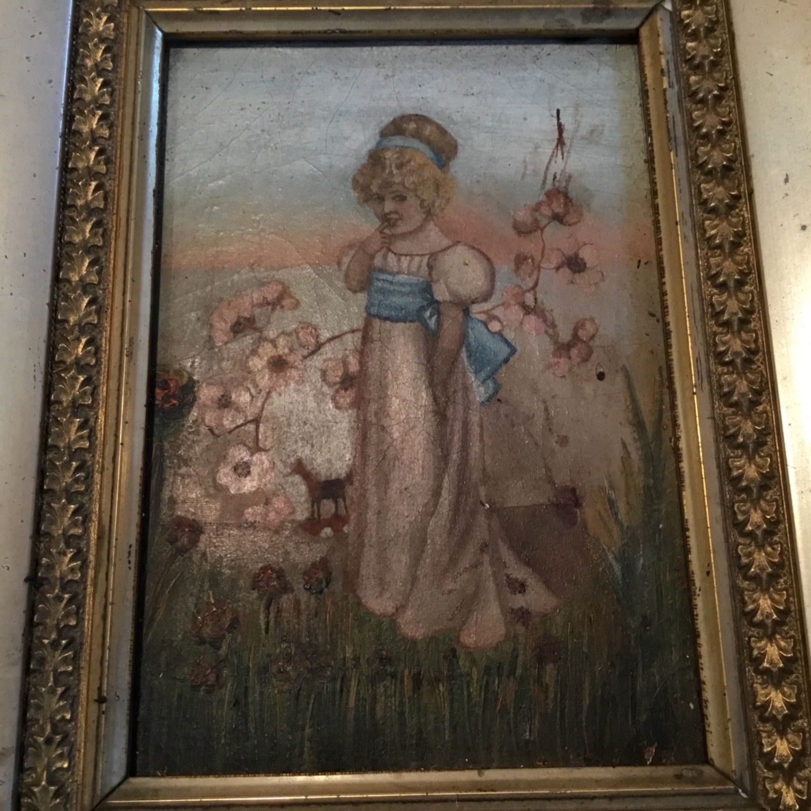 Title (ebay affiliate link): Antique 19th C American Folk Art Primitive Oil Painting Girl w/ Toy Horse AAFA