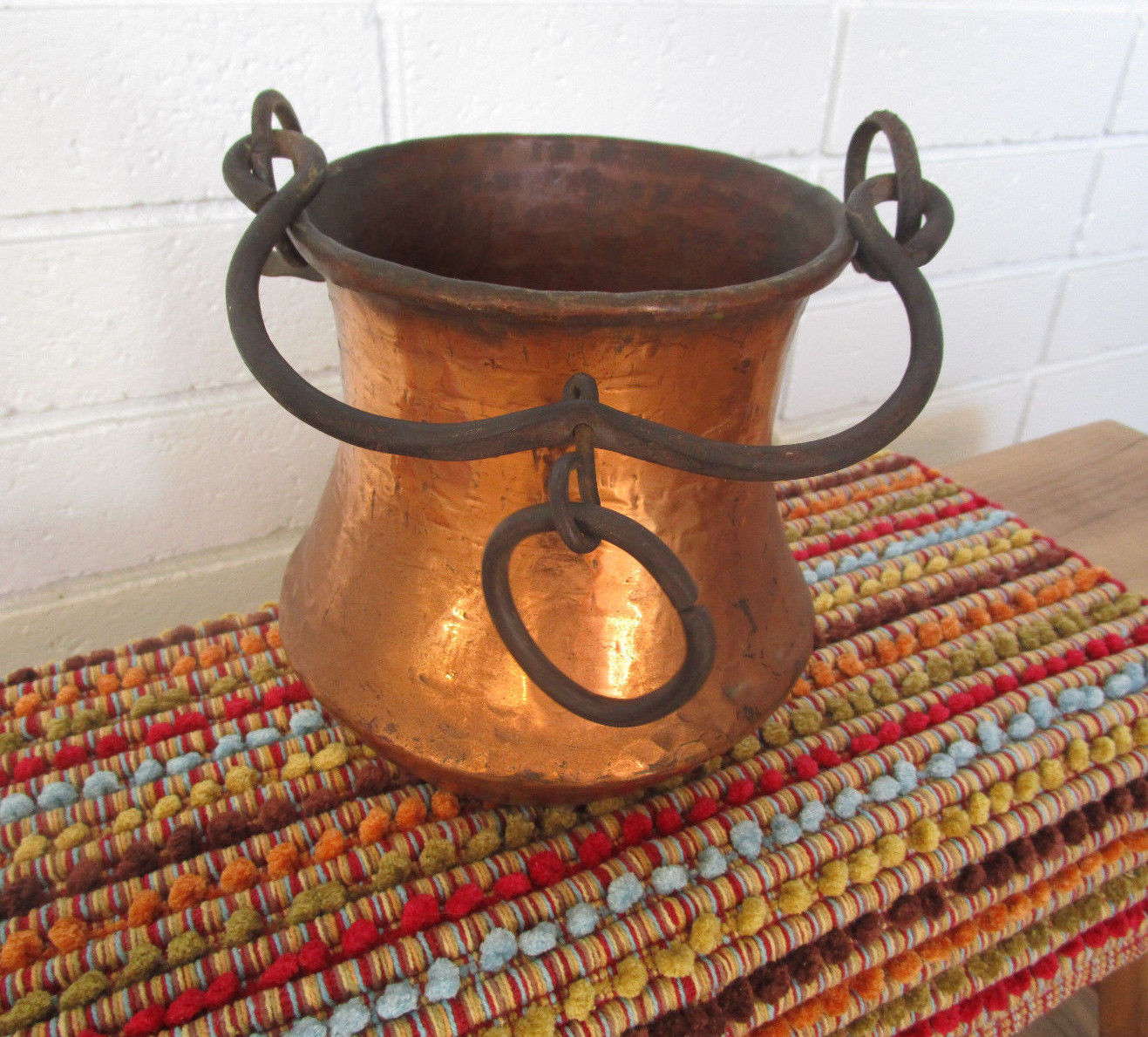 EARLY OLD HEARTH POT KETTLE~HAMMERED COPPER~FORGED DOVETAILS & IRON SWING HANDLE