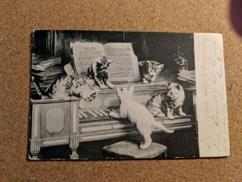 Title (ebay affiliate link): Greeting vintage postcard. Cat. 5 kittens on a piano. Postmarked 1903 Sweden.