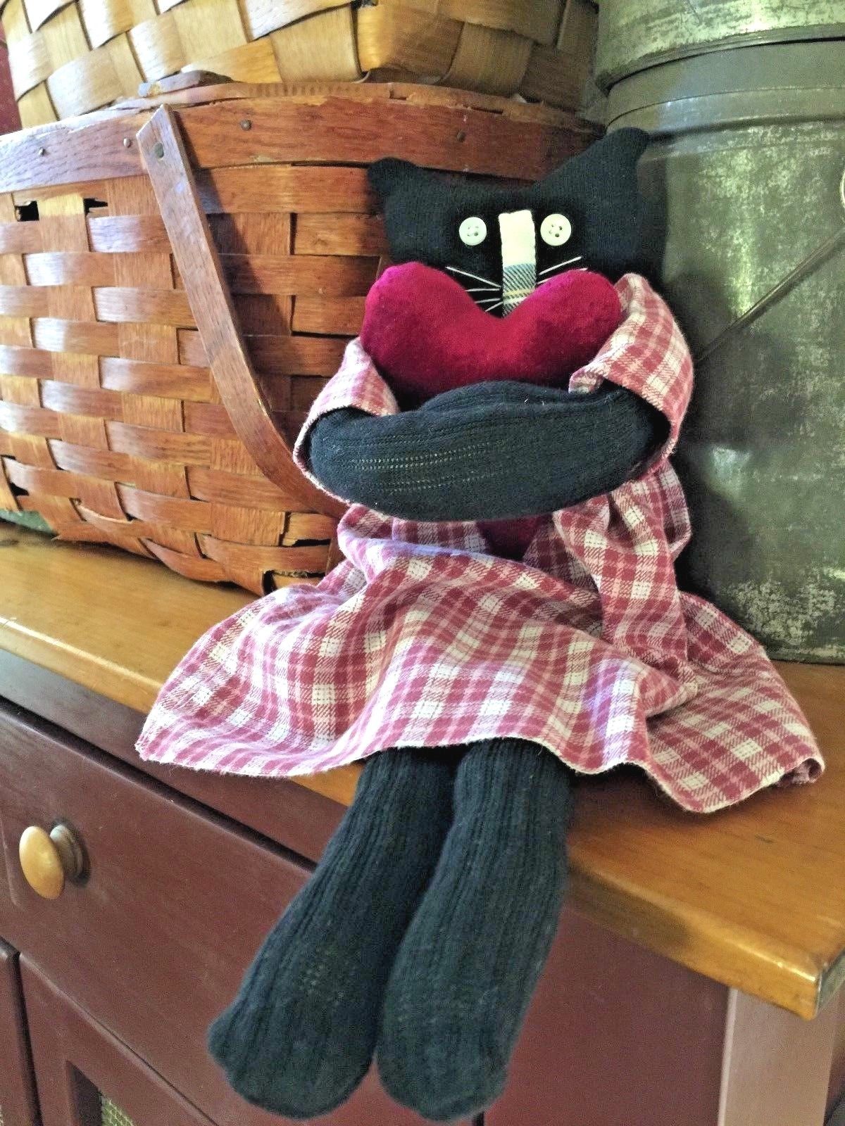 Title (ebay affiliate link): Primitive Stitchery Kitty Cat Sock Doll with Valentine Heart Hazel