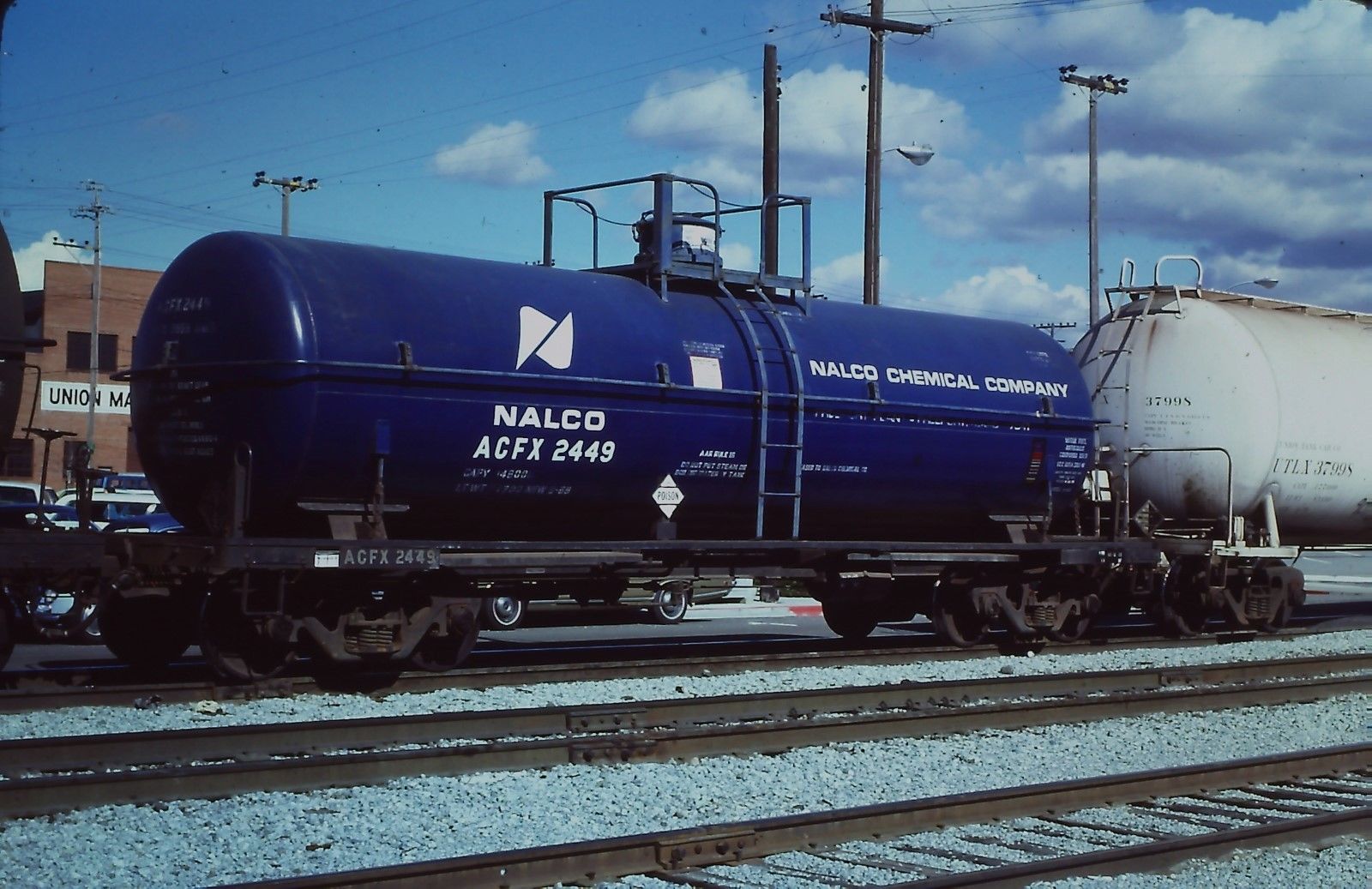 OrigSlide-ACFX #2449 NALCO Tank Car on SP at Bakersfield CA on 3-13-77