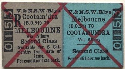 Title (ebay affiliate link): VR & NSWR Ticket - MELBOURNE BO5 to COOTAMUNDRA - 2nd Class Return