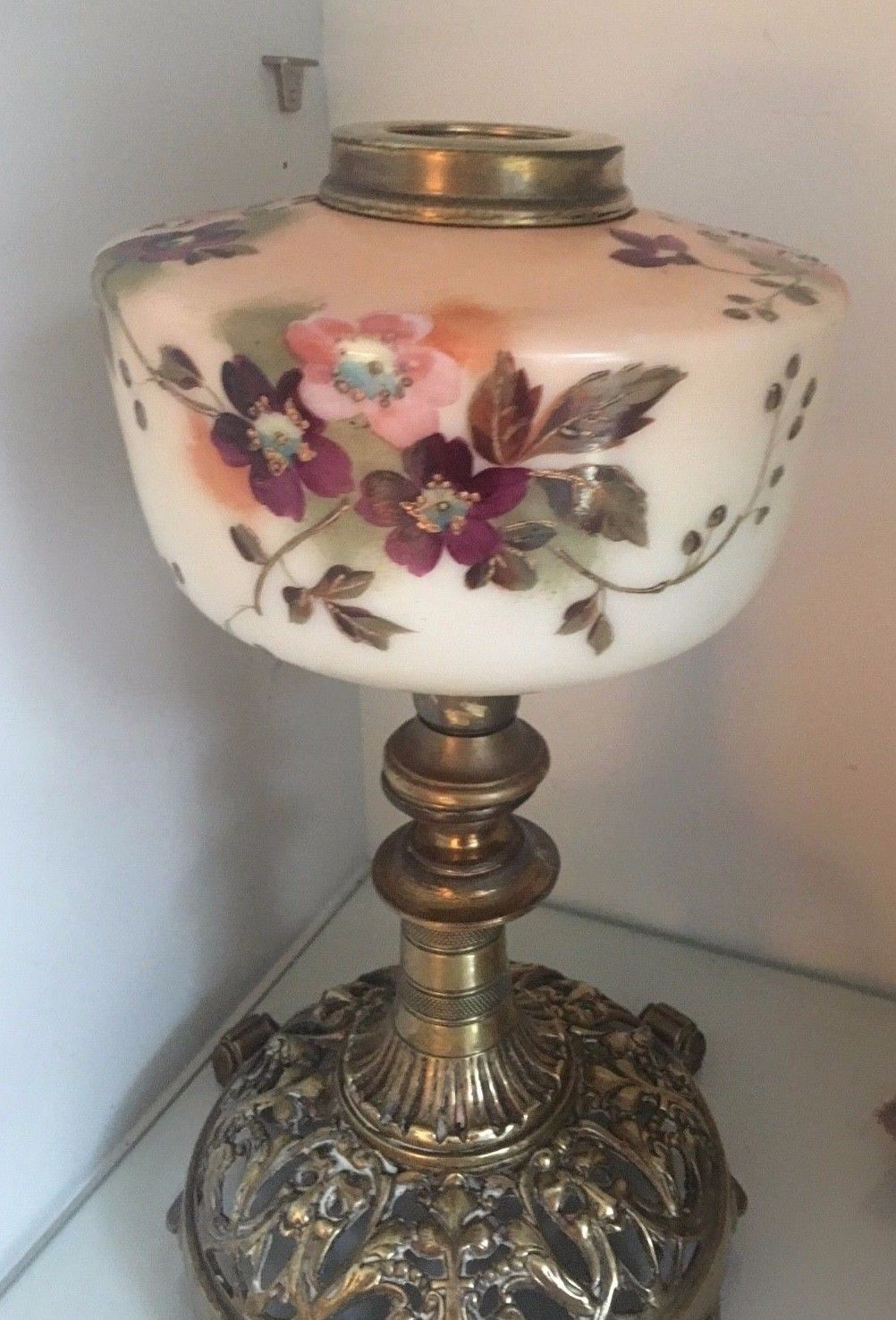 Title (ebay affiliate link): antique oil lamp fancy brass base hand painted floral fount