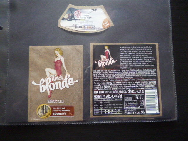 Title (ebay affiliate link): ROBINSON''S."DIZZY BLONDE" ZESTY ALE NOSE ART THEMED 3 LABELS.