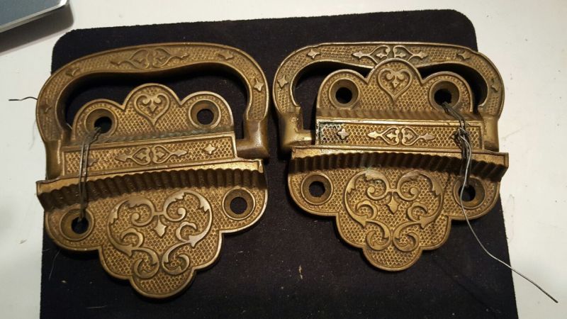 Pair of Fancy Antique 19th Century Cast Iron Tool Chest or Other Handles 1871