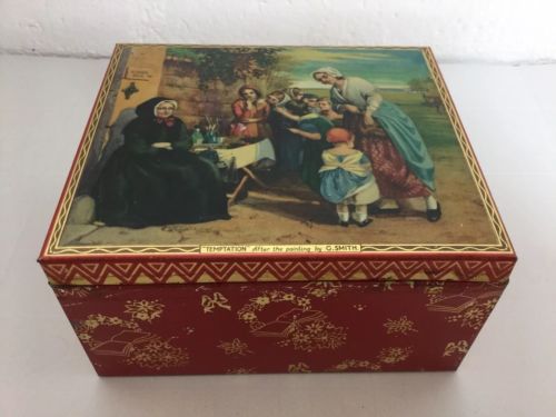Title (ebay affiliate link): VINTAGE ENGLAND TOFFEE CANDY TIN BOX RED W/ANTIQUE PICTURE CHILDREN GIRLS &WOMEN