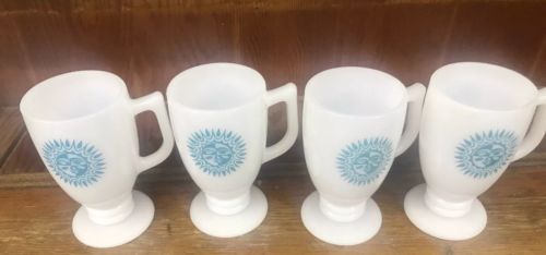 4 Vintage Turquoise Sun Pedestal Milk Glass Mugs