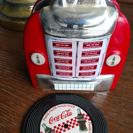 Title (ebay affiliate link): Vintage Coca Cola Jukebox-Shaped Porcelain Coaster Set (Holder + 4 Coasters)