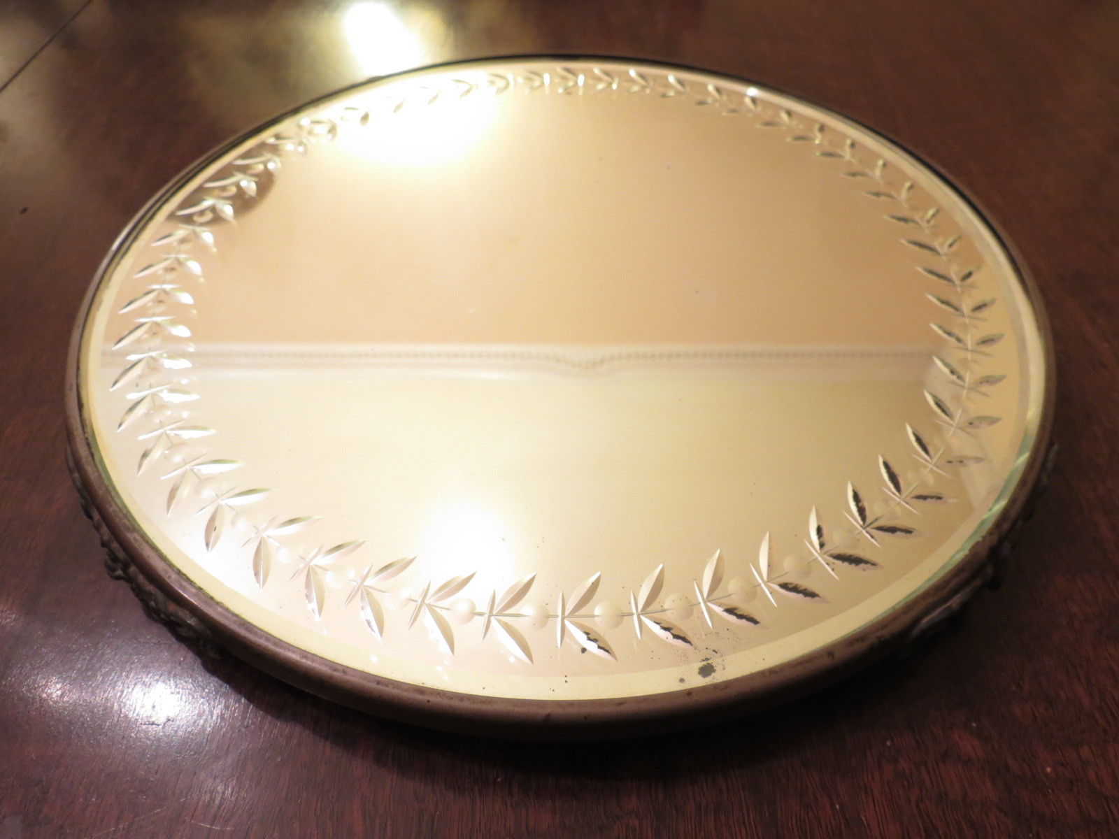Title (ebay affiliate link): Antique Large Beveled Edge 14" Round Footed Floral Garland Cut MIRROR PLATEAU