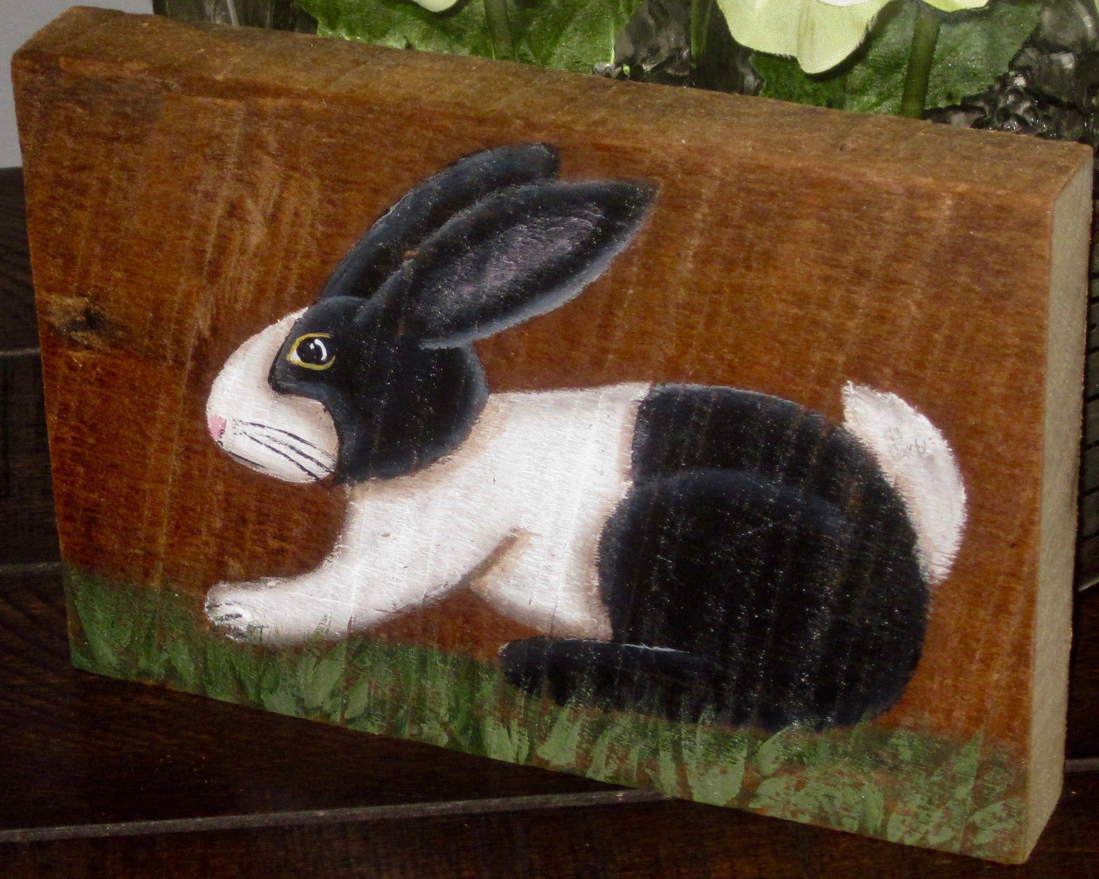 Title (ebay affiliate link): *~*PRIMITIVE*~* HP FOLK ART PRIM BLACK AND WHITE BUNNY *~* OLD RECLAIMED WOOD