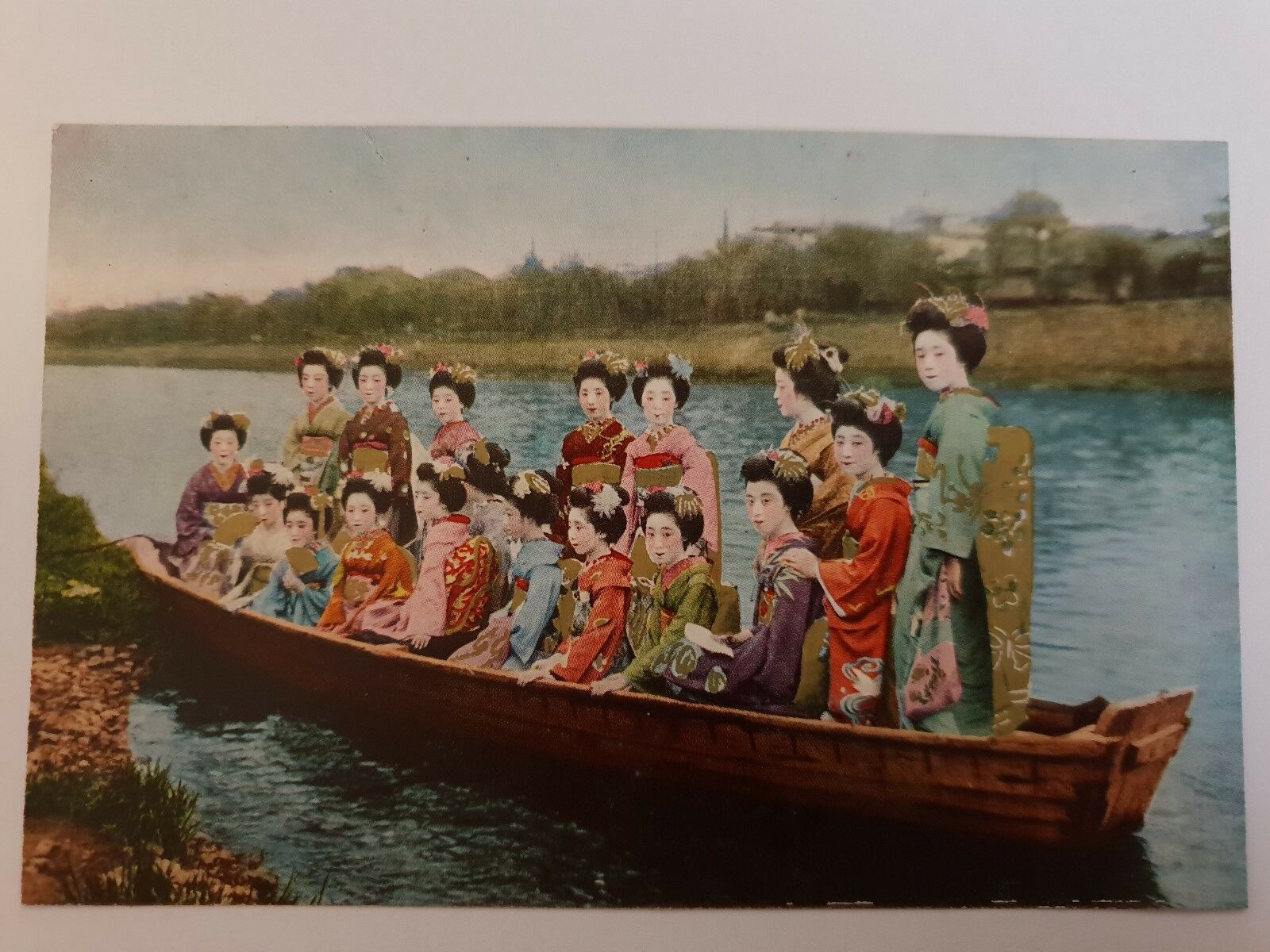 Vintage Japanese postcard - Geisha girls on the river (0560)