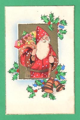 VINTAGE FRENCH CHRISTMAS DIE CUT SANTA CLAUS POSTCARD SACK TOYS BELLS HOLLY