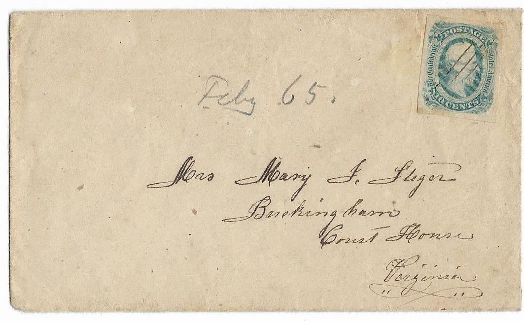 CSA Cover to Mrs. Mary T. Lieger in Buckingham, Va CS#12 Stamp, February (65)