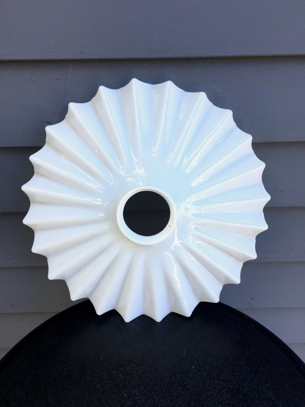 Title (ebay affiliate link): Vintage milk glass saucer type flat light lamp shade fluted ruffle pleated 10"