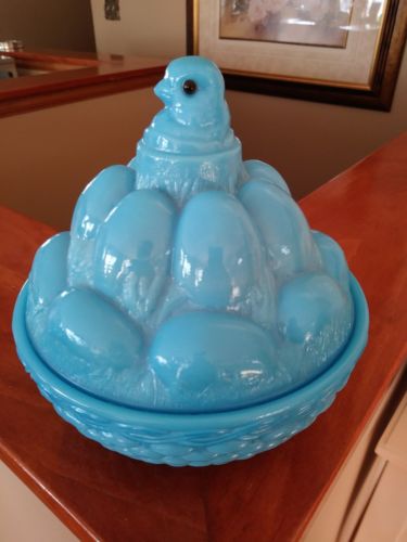 Title (ebay affiliate link): Blue Milk Glass Chick w Amber glass Eyes on Nest of Eggs Candy Dish EUC