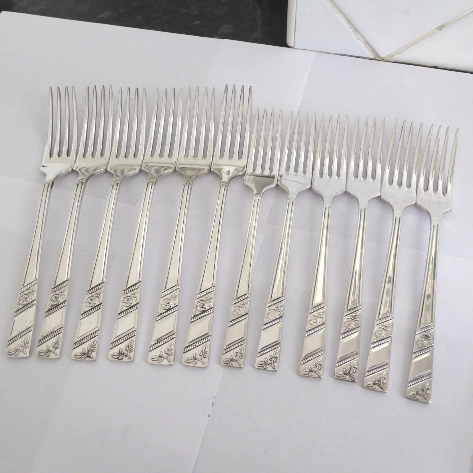 Title (ebay affiliate link): VINTAGE 12 SILVER PLATE 6 DINNER 6 SIDE FORKS VINERS SILVER ROSE PATT - GLEAMING