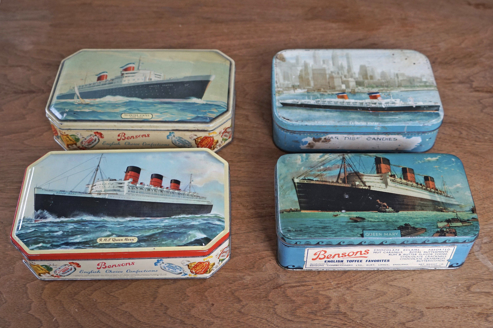Title (ebay affiliate link): Lot of 4 vintage, British candy tins depicting ocean liners - Bensons and Hawkes
