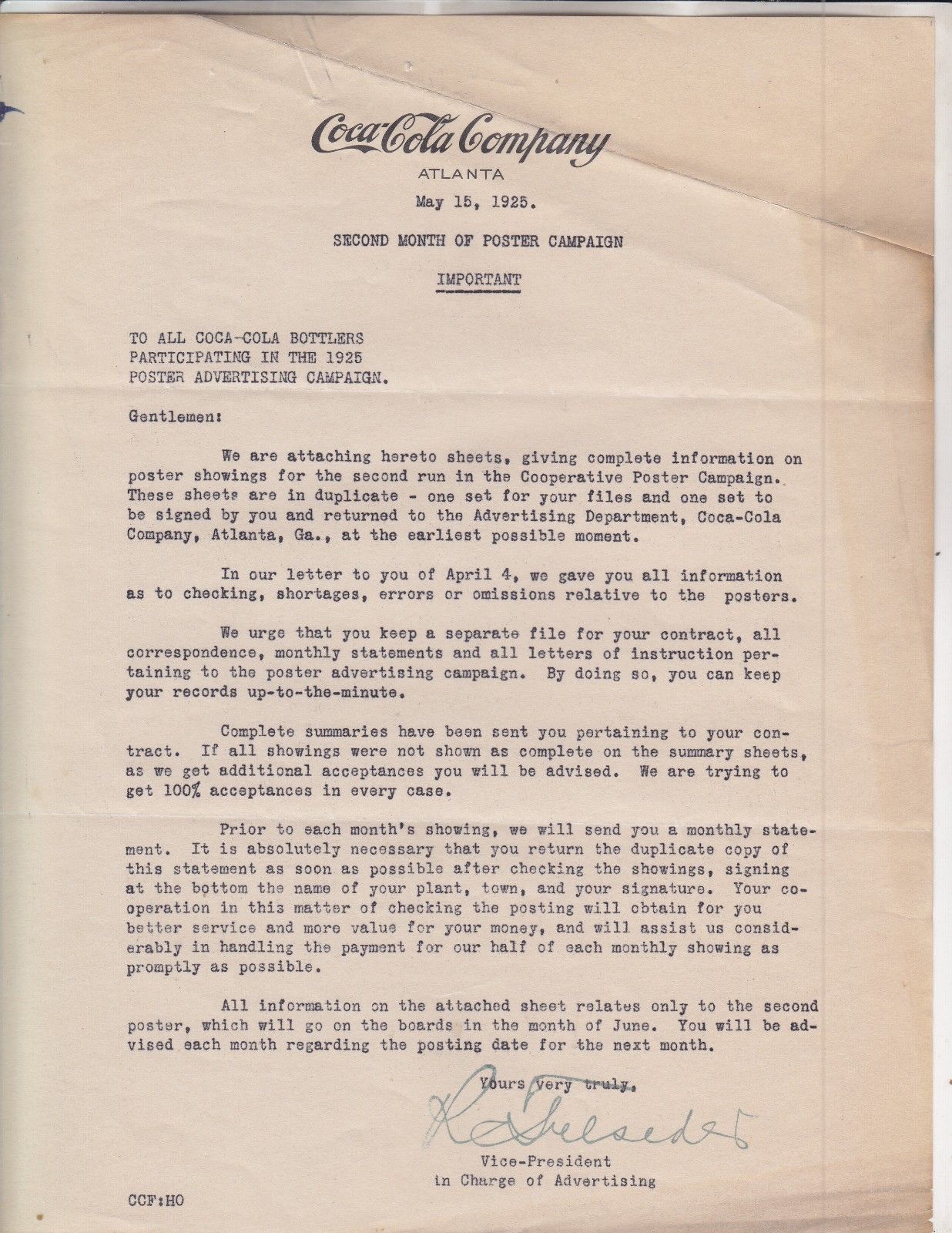 COCA-COLA COMPANY ATLANTA GA. LETTERHEAD MAY 15, 1925 POSTER CAMPAIGN