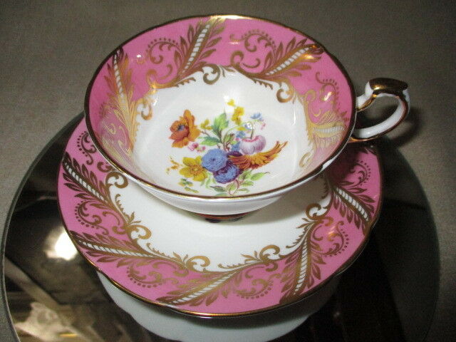 Title (ebay affiliate link): CUP SAUCER PARAGON GOLD LEAFY GARLAND CANDY KISS PINK VERGES HP MIXED FLOWERS