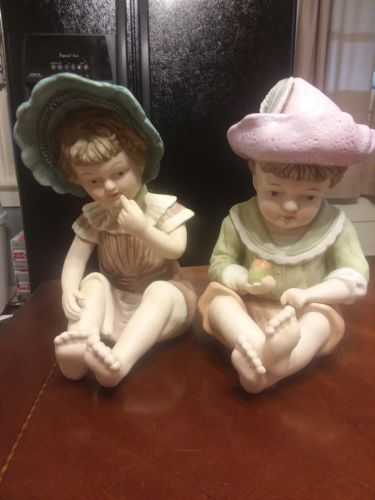Vtg Bisque Boy & Girl Piano Baby Babies Figurines Set of 2