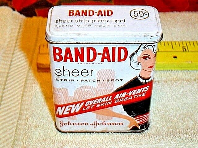 Title (ebay affiliate link): Vintage BAND-AID Sheer Tin Can With Lady In Black Depicted