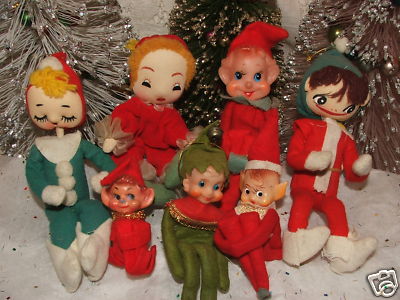 Title (ebay affiliate link): SEVEN VINTAGE FELT PIXIE ELF DOLL CHRISTMAS ORNAMENTS!