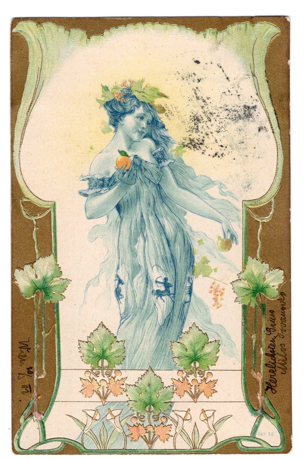 Title (ebay affiliate link): Art Nouveau 1902 Jugendstil lady with fruits in gold frame A0934