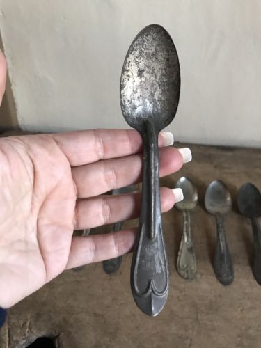 Title (ebay affiliate link): 9 Old Heart Handle Tin Spoon Set Primitive Collection Worn Tattered AAFA