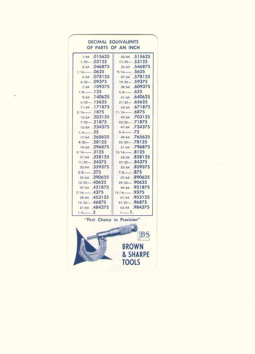 Title (ebay affiliate link): VG BROWN & SHARPE TOOLS DECIMAL EQUIVALENTS & TAP DRILLS WALLET SIZE CARD