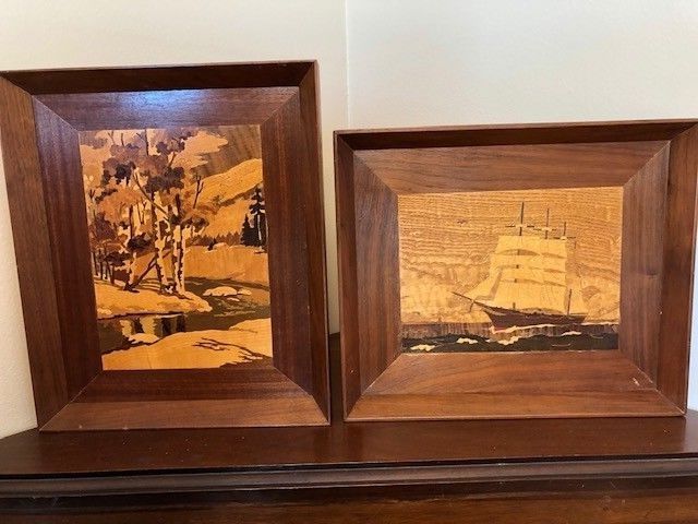 Title (ebay affiliate link): 2 Vintage European marqueterie inlaid wood plaques folk art: forest and ship