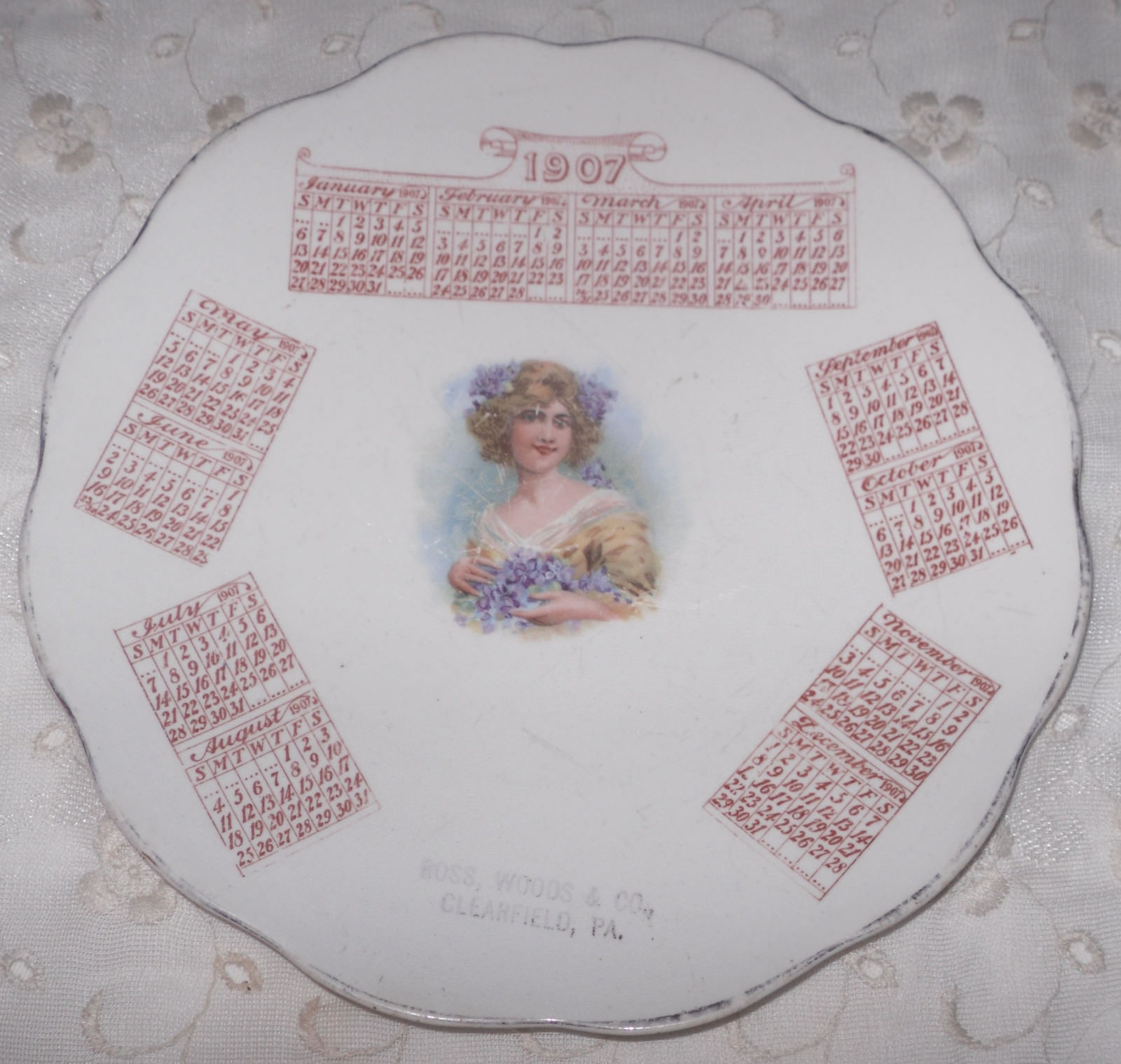 1907 Antique Victorian Girl w/Violets CALENDAR PLATE Ross Woods&Co Clearfield PA