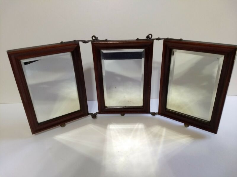 Antique Wooden 3-Panel Small Mirror Folding Hanging Chain or Standing Tabletop
