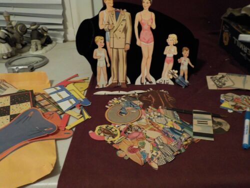Title (ebay affiliate link): VINTAGE PAPER DOLLS- FAMILY OF 5 WITH LOTS OF EXTRAS, CHAIRS & LAMP