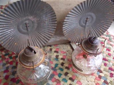 2 Primitive Vintage Clear Glass Eagle Kerosene Lamps With Tin Reflectors