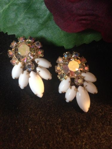 Vintage Stunning Milk Glass & AB Rhinestone Clip Earrings