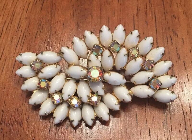Title (ebay affiliate link): Vintage Large Juliana White Milk Glass Navette AB Rhinestone Brooch Pin ~Pretty!