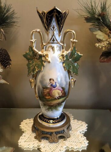 Antique Porcelain Lady Portrait Handled Vase Gilt On Brass Base Marked
