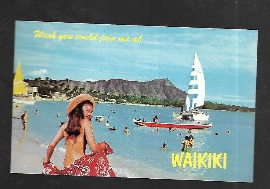 Title (ebay affiliate link): Vintage Postcard Greetings Waikiki Beach Hawaii Swimming Surfing Topless Girlie