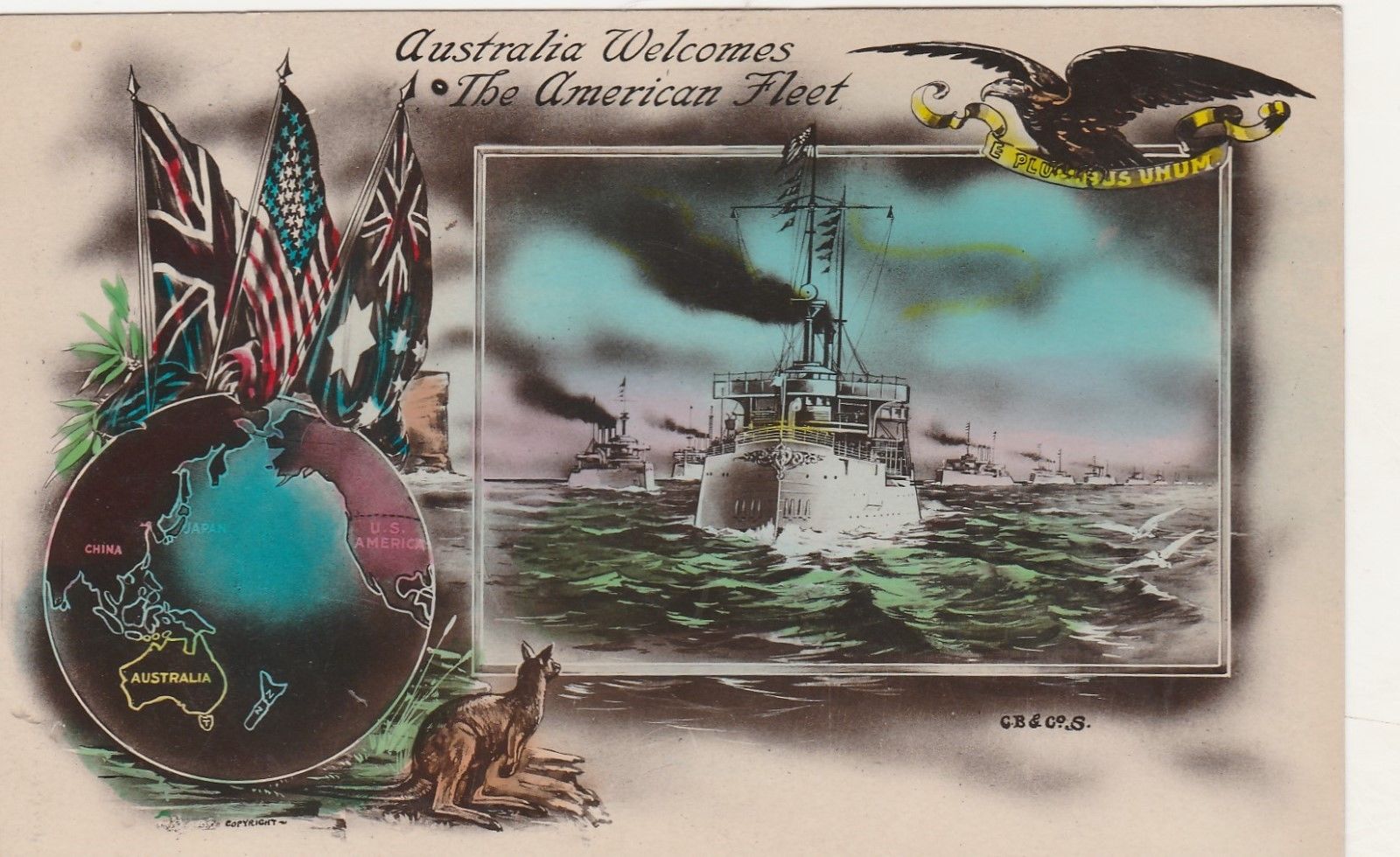 Title (ebay affiliate link): VINTAGE POSTCARD AUSTRALIA WELCOMES THE AMERICAN FLEET 1908