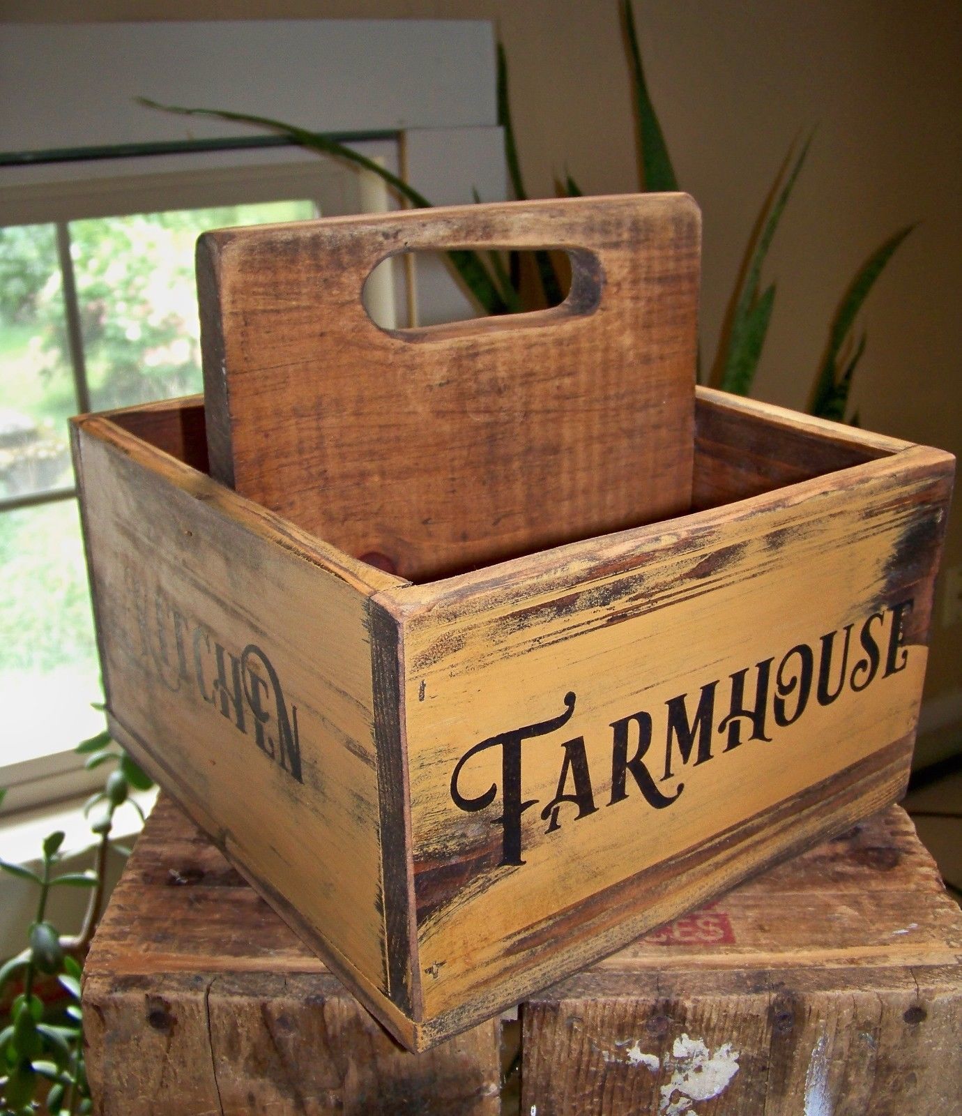 Title (ebay affiliate link): Primitive Painted Farmhouse Wood Divided Tote Box Handcrafted 4 Stencil Sides